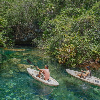 Conviértete en un explorador y descubre la selva maya a tu manera: nada, salta, diviértete en los kayaks y disfruta de las zonas de descanso en cuatro cenotes.